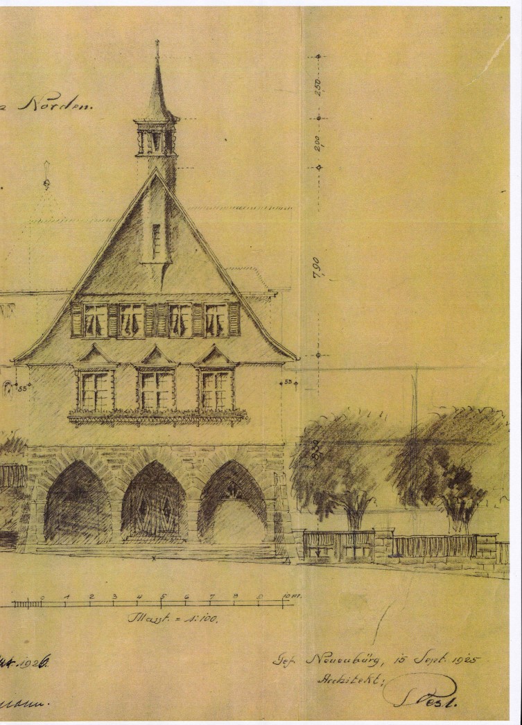 Im Mai 1925 legt Architekt Rest aus Neuenbürg die Pläne und den Kostenvoranschlag für ein neues Rathaus vor. Es wird mit Kosten von 70- 80.000 RM gerechnet. Die wichtigsten Arbeiten werden vergeben. Die Rohbauarbeiten übernimmt die Fa. Völlnagel aus Schömberg.